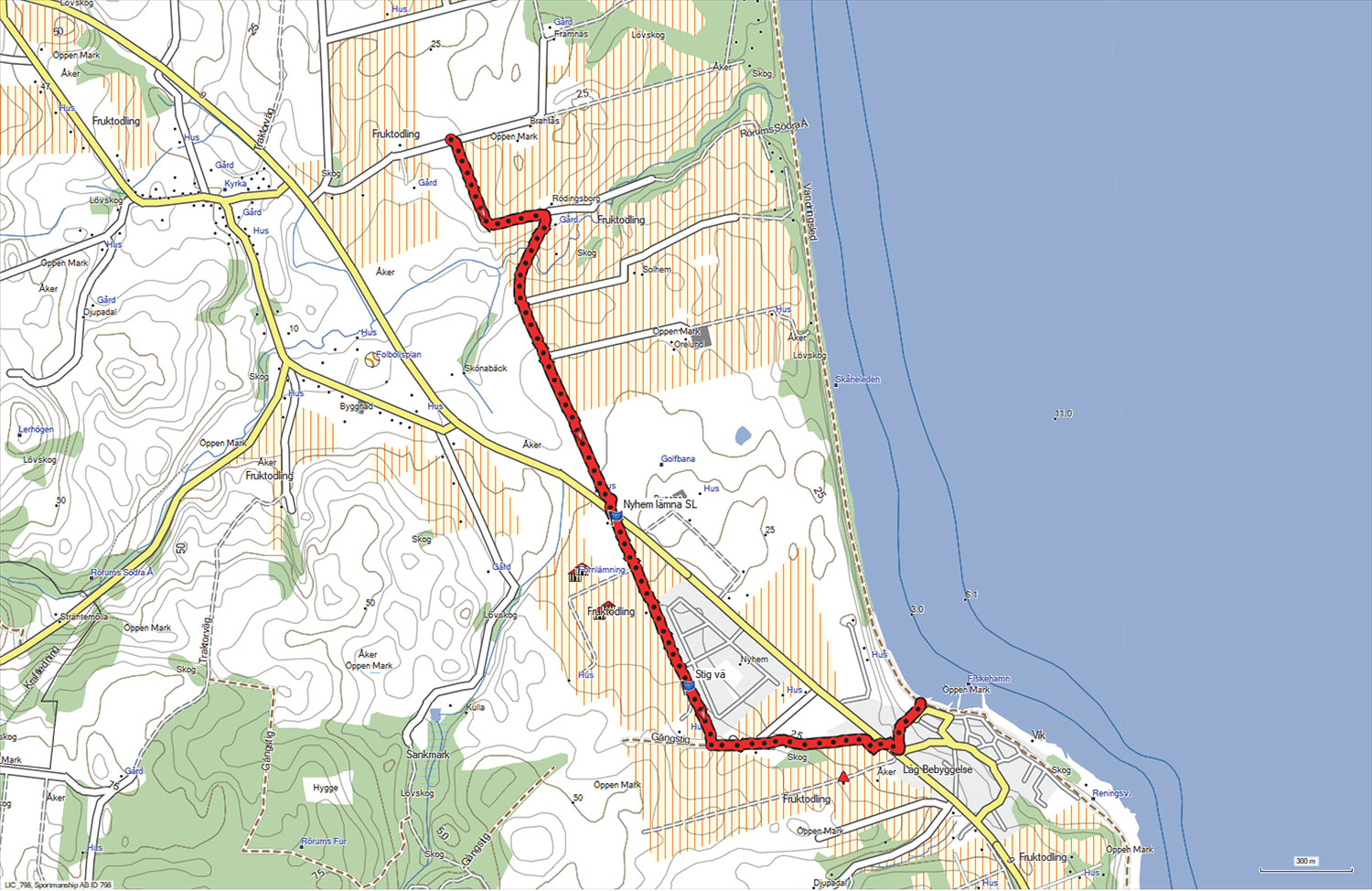 F. Den gulmarkerade stigen intill bommen är nu även orange markerad Skåneled och röd/vit